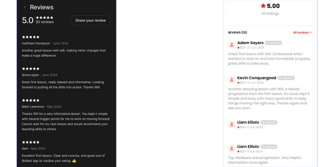 There are 2 apps that I use, Setmore for all Bookings & Payments, as well as Skillest for all Lesson Records & Online Coaching. You can access Setmore online or download the app yourself, however, you will need to download Skillest onto your phone. Both of these apps give you full 24/7 access to my diary & your lesson records, allowing you to look back at drills, communicate with me & book in for a lesson whever you are in the world.
